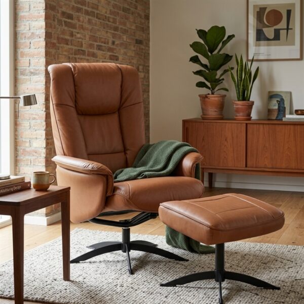 Hjort Knudsen 3255 Lænestol med Fodskammel Cognac m. krom | Møbelsalg.dk